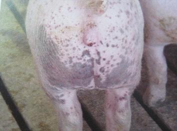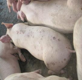 1、前期豬群輕度采食下降,部分豬出現(xiàn)陣咳,皮膚出現(xiàn)紅色丘疹,眼睛流淚結(jié)膜潮紅,個別豬流清水鼻涕。