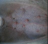 圖-1:全身、臀部皮膚紅色丘疹斑,體溫39—41度,輕度厭食。