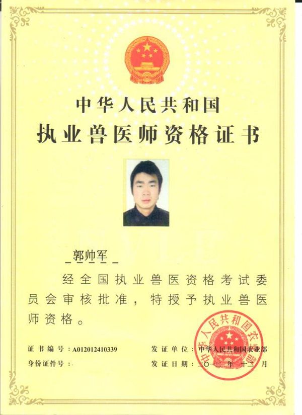 熱烈祝賀天祥獸醫(yī)院郭帥軍同志榮獲中華人民共和國執(zhí)業(yè)獸醫(yī)師資格證書